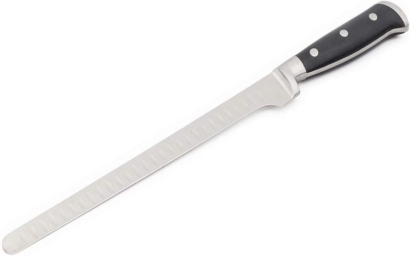 Le couteau à saumon et à jambon est plus souple et plus long. Il est généralement utilisé pour couper plus facilement vos pièces en fines tranches. En plus d’être léger, ce type de couteau est facilement maniable.